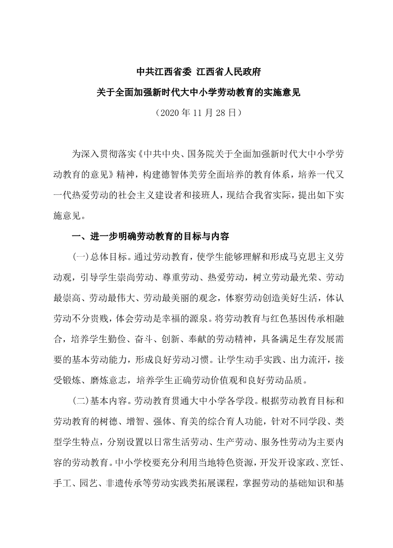 中共江西省委 江西省人民政府关于全面加强新时代大中小学劳动教育的实施意见