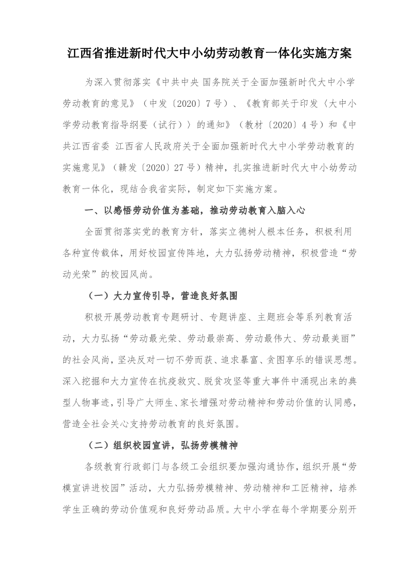 江西省推进新时代大中小幼劳动教育一体化实施方案