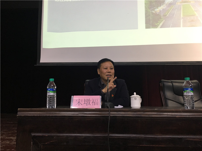 讲座中,宋墩福结合自身工作经历介绍了学院悠久的办学历史,从“学生管理,创新创业,校园文化,开放办学”等方面来介绍学院办学特色和办学成就。接着他用杨善洲、塞罕坝机械林场和八步沙林场“六老汉”治沙事迹以及学院优秀校友坚守大山的案例诠释了林业人的初心和使命,同时他希望同学们坚守初心,做一个有高尚道德情操、有创新精神、有技术技能的林业人,为美丽中国、生态文明建设作出应有贡献。