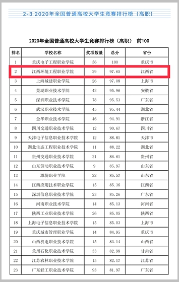 3月22日,中国高等教育学会高校竞赛评估与管理体系研究工作组发布2020全国普通高校大学生竞赛排行榜(高职),江西环境工程职业学院以奖项数量29项,总分97.65分,位列全国第二名,江西第一名。