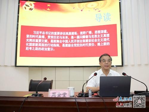 周金堂指出,‘七一’重要讲话高屋建瓴、视野广博、思想深邃,紧扣时代脉搏,贯穿历史与未来,是一篇闪耀着马克思主义真理的重要文献,是鼓舞全中国人民开创全面建设社会主义现代化国家新局面的行动指南,是激励全党担负时代责任、踏上新的赶考之路的政治宣示。