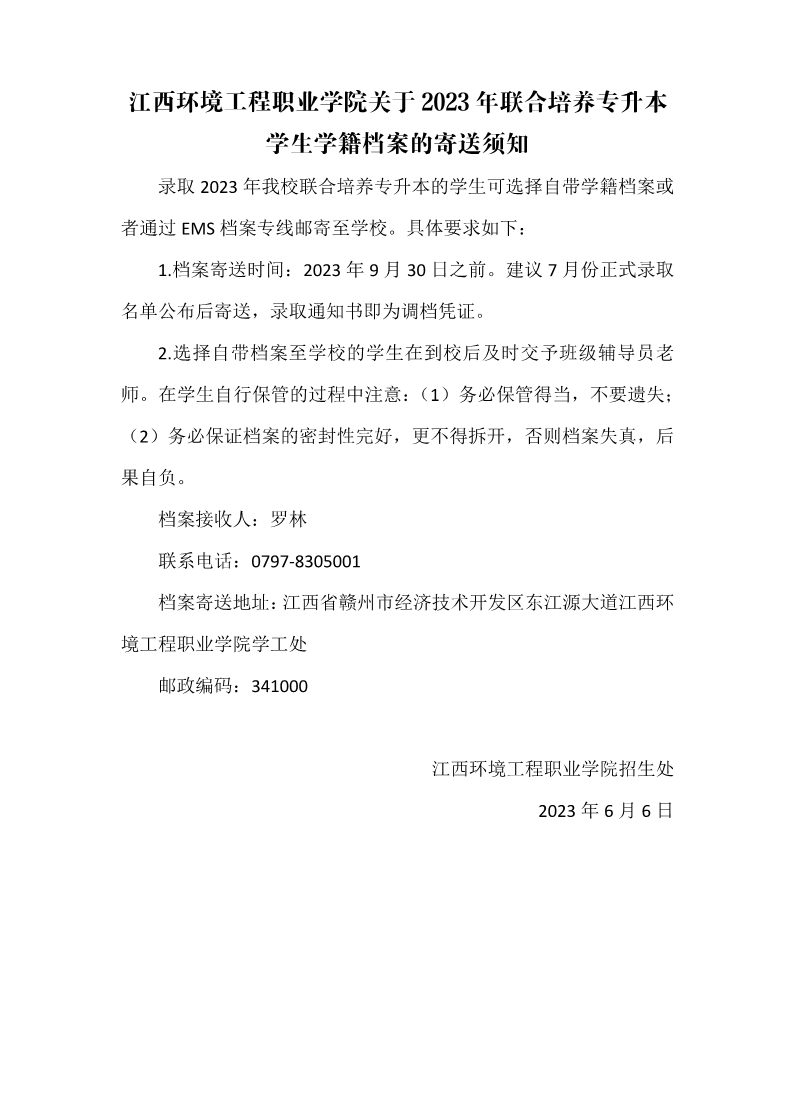 江西环境工程职业学院关于2023年联合培养专升本学生学籍档案的寄送须知