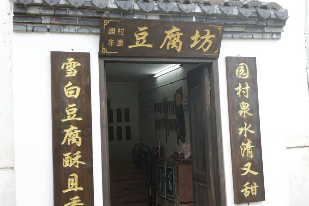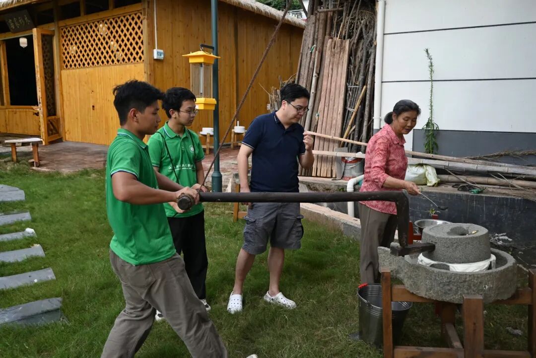 在园村非遗豆腐坊,实践队员们了解到一块豆腐的生产过程是从泡豆、磨浆、虑渣、煮浆、点凝、压制成型,通过以上步骤,就可以制作出新鲜的豆腐。“我们选用优质黄豆,用泉水浸泡,经过磨豆、煮浆、过滤、压制等多道工序制作而成。不同的压制时间和力度,可以做出豆浆、鲜豆腐、豆腐脑、千张等多种的豆制品。”村民一边说着,一边熟练地操作着每个步骤,动作行云流水,实践队员们踊跃参与豆浆研磨过程。