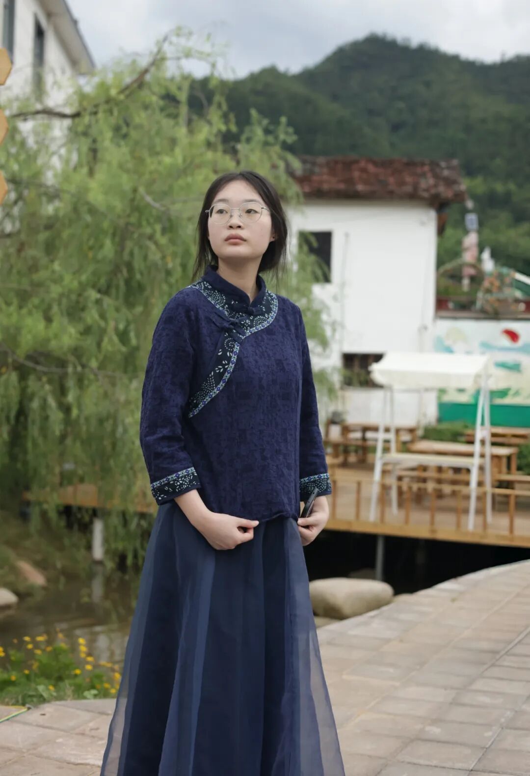 最后,实践队员们与文明实践站工作人员紧密配合,开展非遗服饰宣传。队员们身着精致刺绣采茶服,怀揣传承非遗的热忱蓄势待发。但由于天气突变,原定户外展演被迫临时取消。实践队员迅速调整策略,通过线上线下结合的创新形式,让千年茶服文化在数字空间焕发新生。