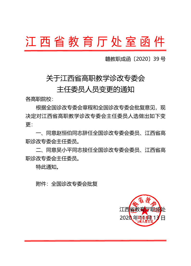 赣教职成函〔2020〕39号教育厅—关于江西省高职诊改专委会主任变更的通知 来源: 发布时间:2020-11-20 10:02:57 浏览次数: 次 【字体:小 大】 终审:质量办 分享到: 【打印正文】