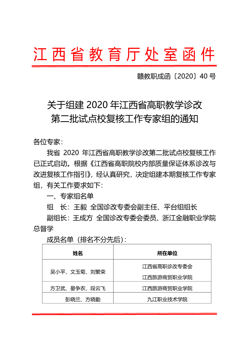 赣教职成函〔2020〕40号教育厅——关于组建2020年江西省高职教学诊改复核工作专家组的通知 来源: 发布时间:2020-11-20 10:03:16 浏览次数: 次 【字体:小 大】 终审:质量办 分享到: 【打印正文】